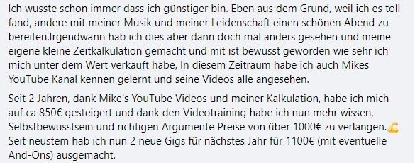 "Weißt du Mike, ich wollte dein Preis-Training schon vor einem halben Jahr buchen und habe gezögert. In dieser Zeit habe ich 12 DJ Bookings gespielt und dort jeweils 800€ als Gage erhalten. Nach dem Training liegt meine nun Gage bei 1400€ und ich verkaufe sie besser als die vorher.